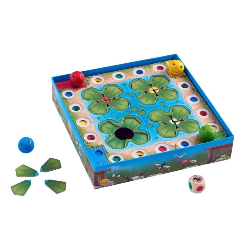 Four cheerful marble frogs want to become jumping champions. Time and again they jump around the pond with some dice luck. For each completed round, players may turn over a petal of their own water lily.