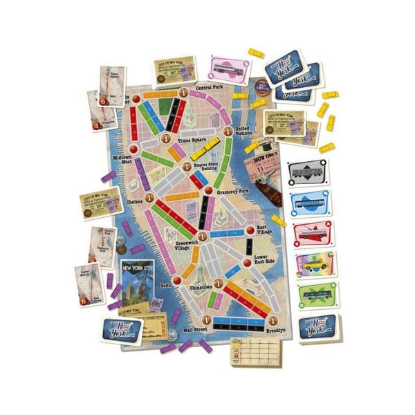 In deze uitgave van Ticket to Ride zijn treinkaarten bovendien vervangen door speciale taxikaarten en ook de miniatuurtreintjes zijn anders, dit zijn nu plastic taxi miniaturen. Maak nu jouw unieke trip in de Big Apple!